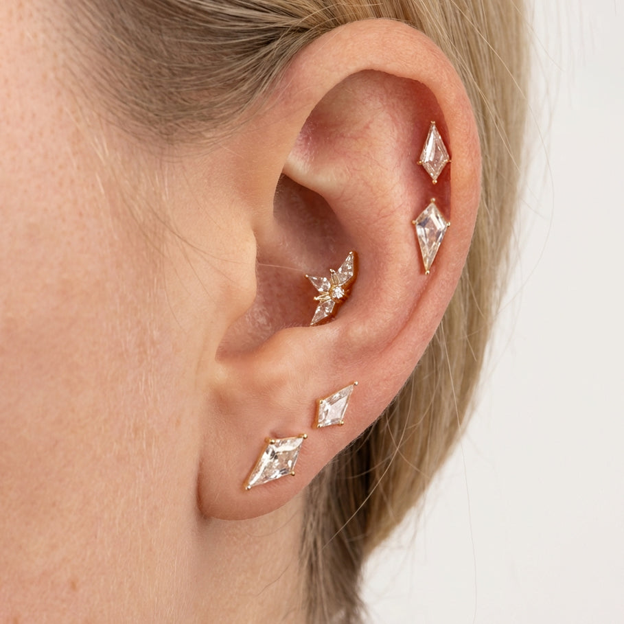 Chic and versatile, these flat back stud earrings are crafted in both gold and silver finishes. The shimmering kite-cut dainty studs offer a secure fit for lobe and cartilage piercings, blending minimalist style with timeless sparkle. Designed with a reverse flat back, they’re effortless to put on and comfortable enough for everyday wear.