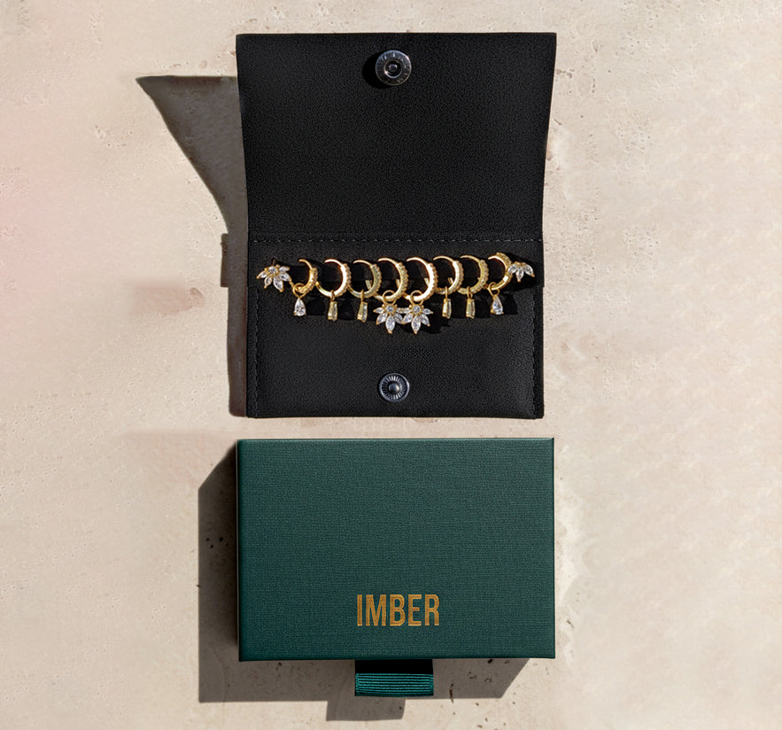 All IMBER earrings arrive in our sleek, vibrant signature slide-open box with a modern textured finish, complete with a jewelry pouch for safe keeping and effortless gifting.