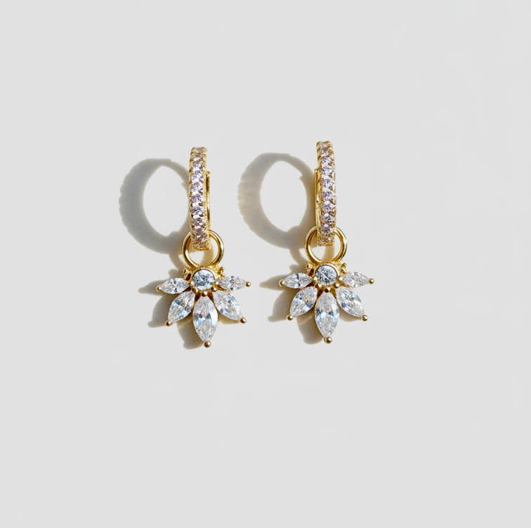 Designed for modern brides, this bridal jewelry set includes elegant floral earrings with pavé detailing and dainty drops. Styled as wedding jewelry or as refined bridesmaid earrings, it delivers both impact and versatility. Each piece can be layered for a statement stack or worn individually for subtle elegance. A timeless design that completes any wedding look.