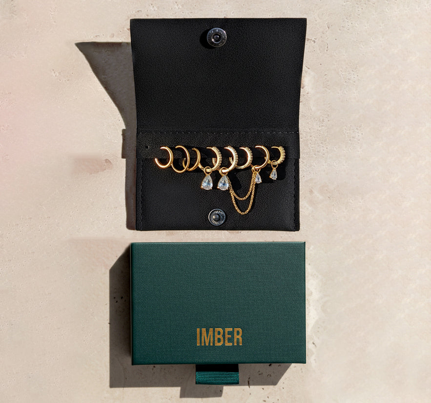 All IMBER earrings arrive in our sleek, vibrant signature slide-open box with a modern textured finish, complete with a jewelry pouch for safe keeping and effortless gifting.