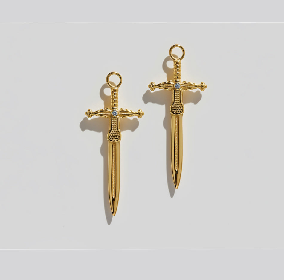 Make a fearless entrance with this striking stack of statement earrings, blending bold design with fine detail. Featuring gleaming gold sword charms, shimmering kite-cut gem drops, and kite-cut stud earrings, this stack is made for those who crave bold earrings with edge.