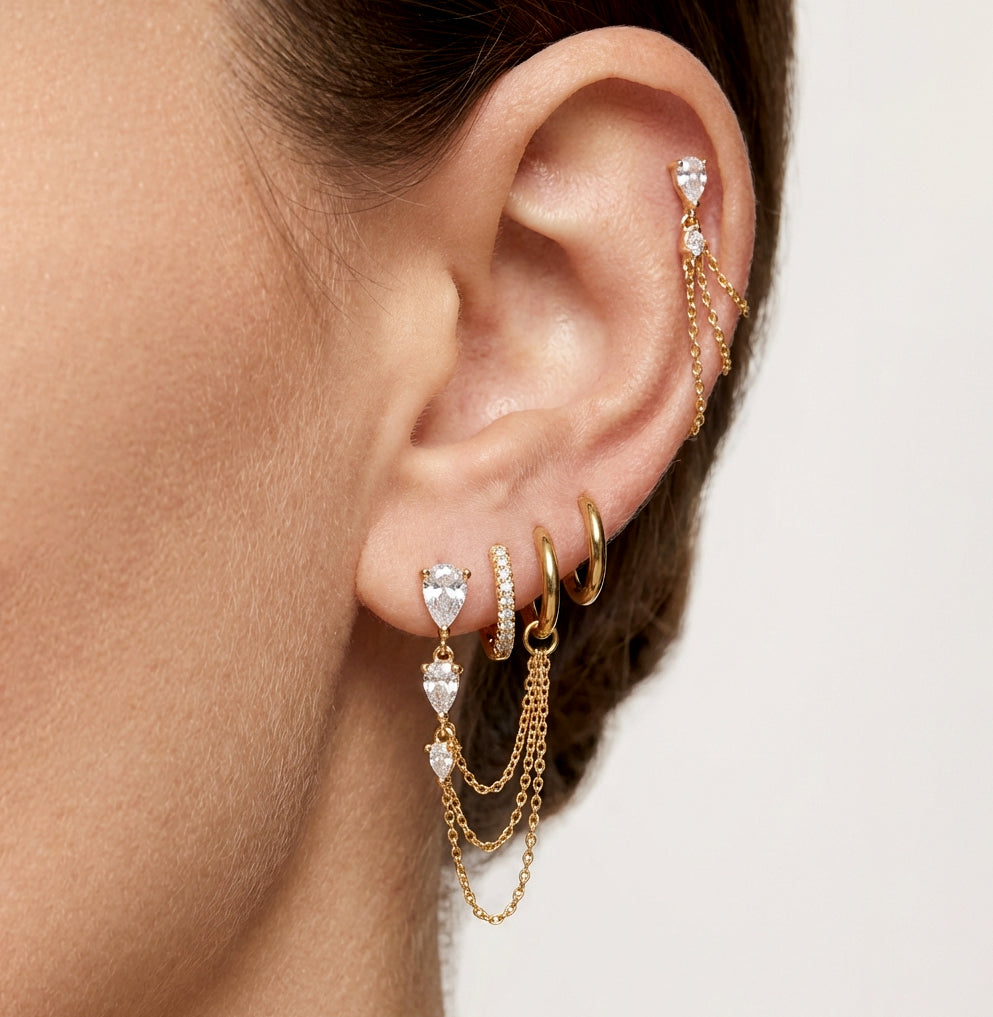 - 2 Pieces, Triple Pear Gems with Triple Chain - double piercing earring.